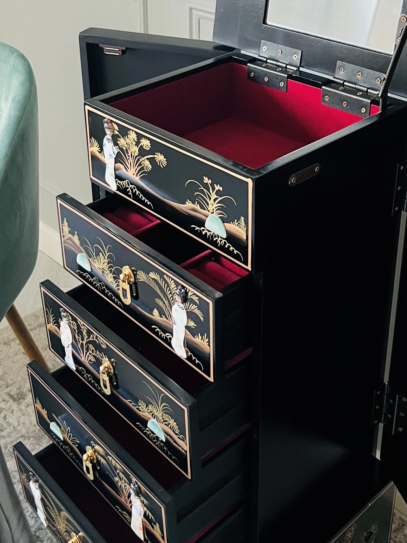 - With the artwork complete, several layers of natural lacquer are applied to create a protective coat and enhance both the vibrant colours and shimmering pearl.