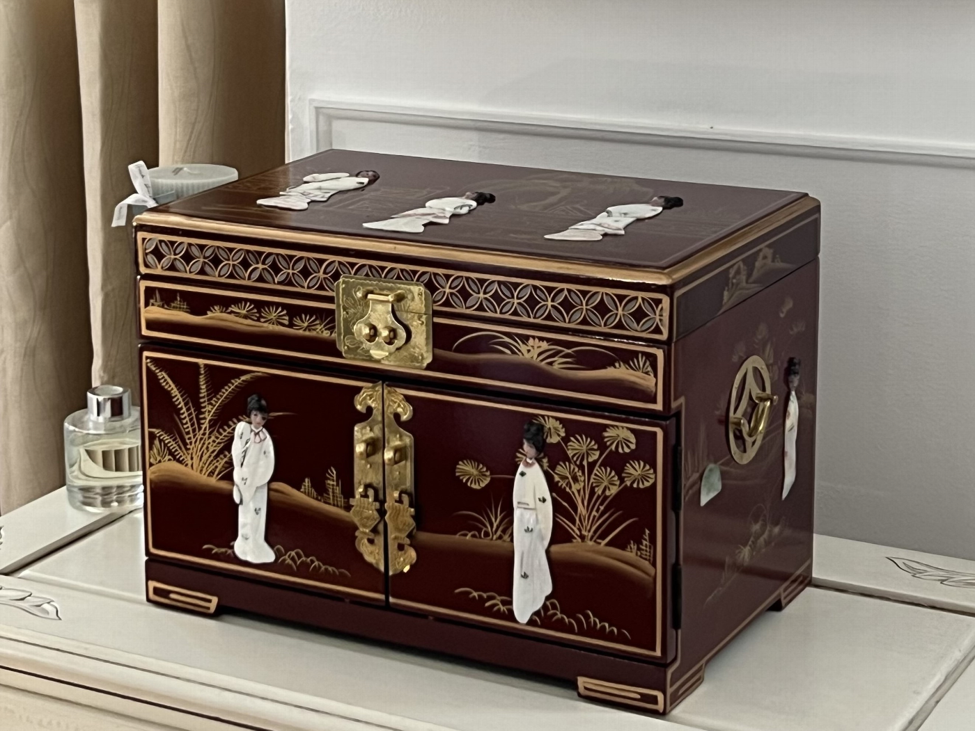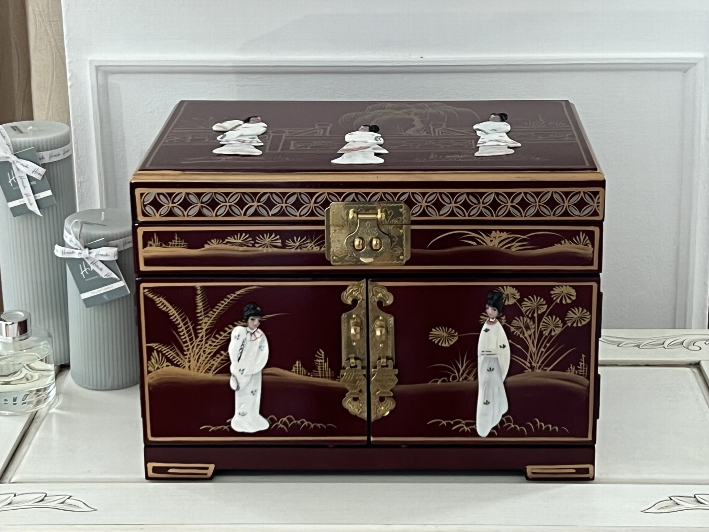 Chinese Hand Painted large Jewellery Box with Carved Mother Of Pearl Figurines and Gold painted detailing
