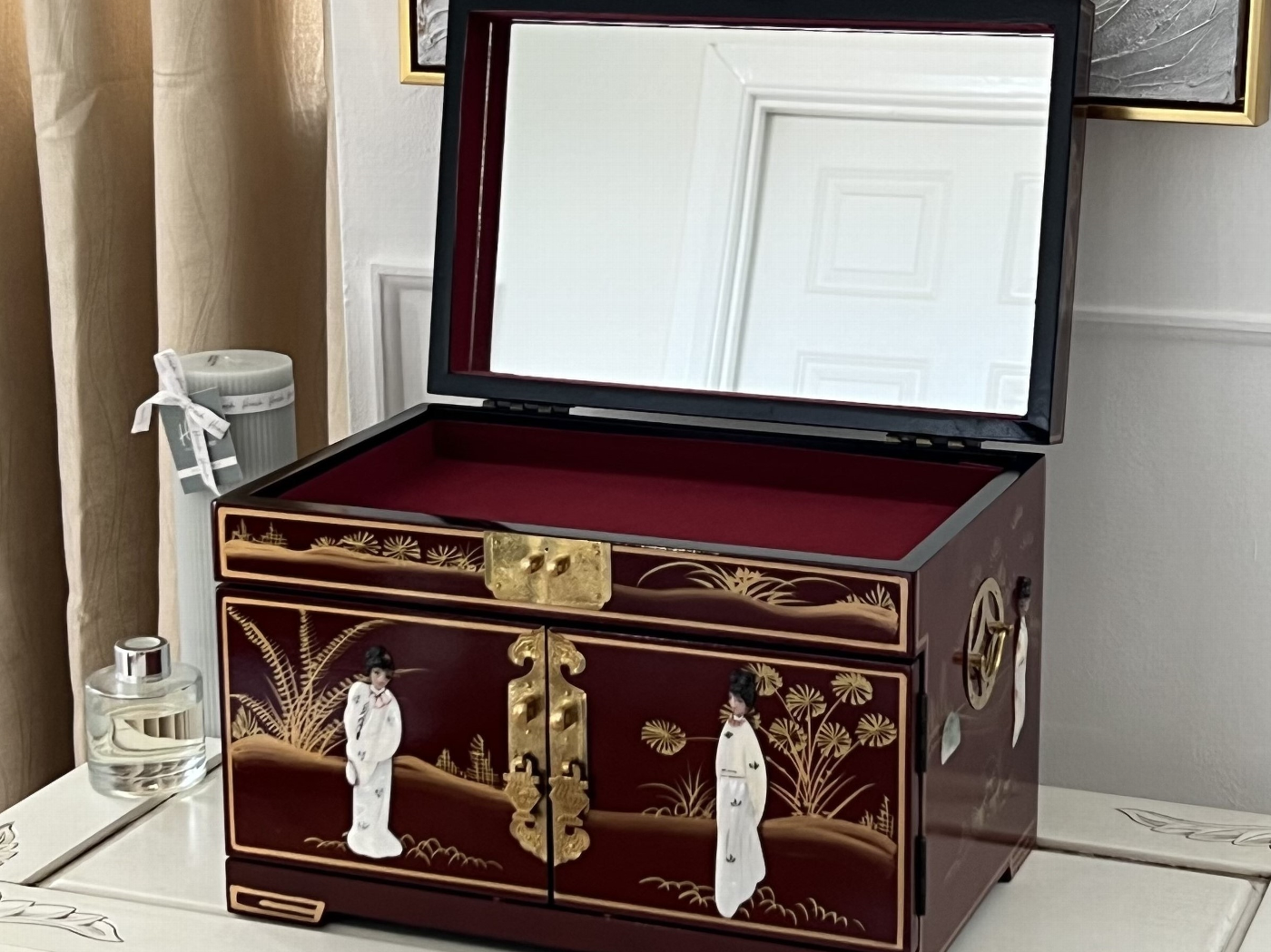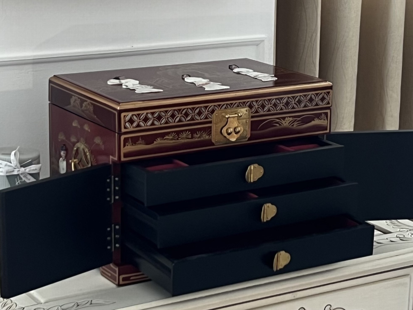 Simply stunning Hand Painted Jewellery Chest finished in Deep Red,  expertly Hand Painted with Gold Detail and finished with Carved Mother Of Pearl Figurines. The Jewellery Box has an array of drawers and compartments along with a Ring Tray and inset Mirror. The piece is supplied with a traditional style lock and key where the top compartment can be locked . There is a further Drawer to the lower section , Interior is Lined with deep red felt material