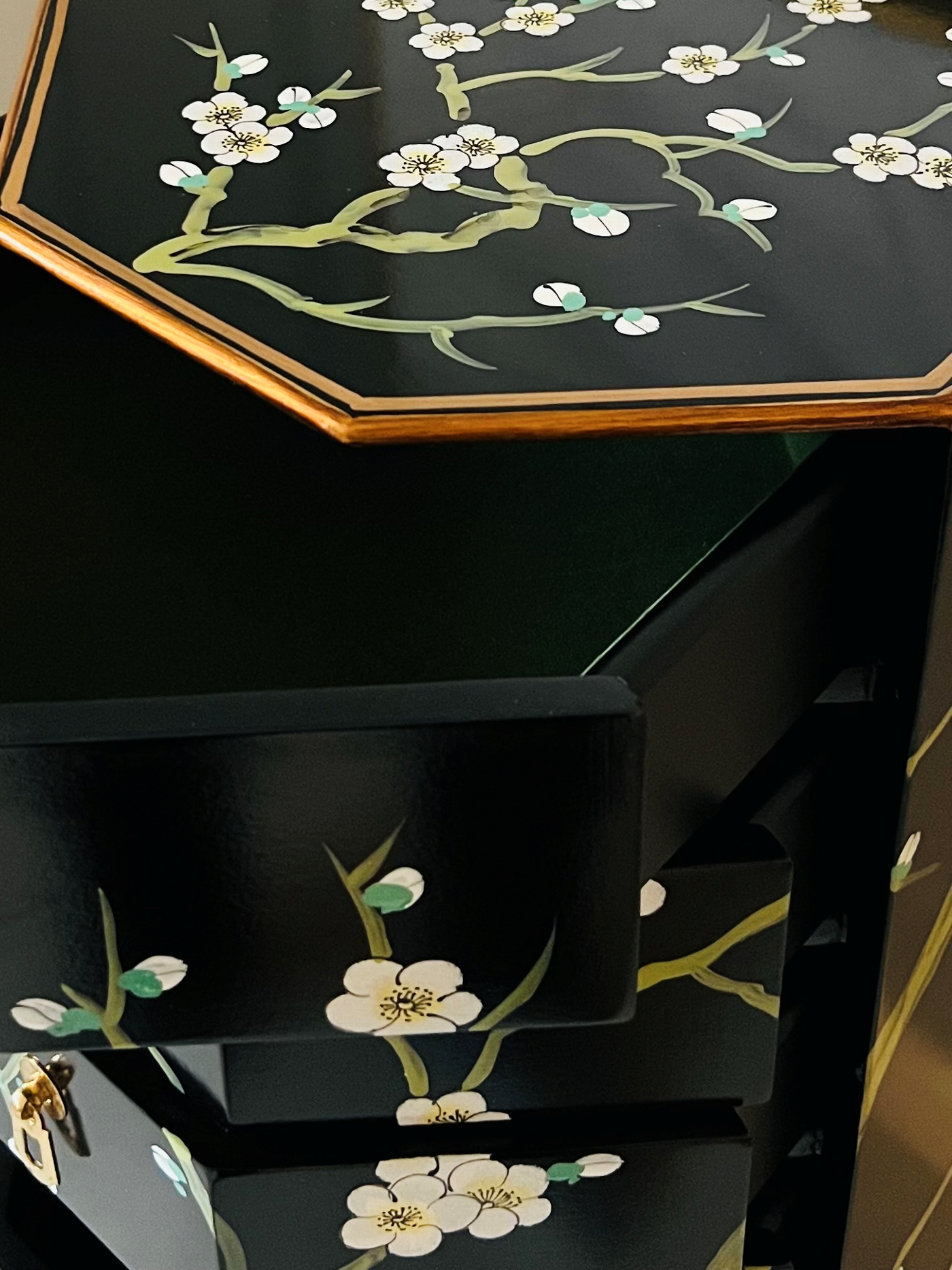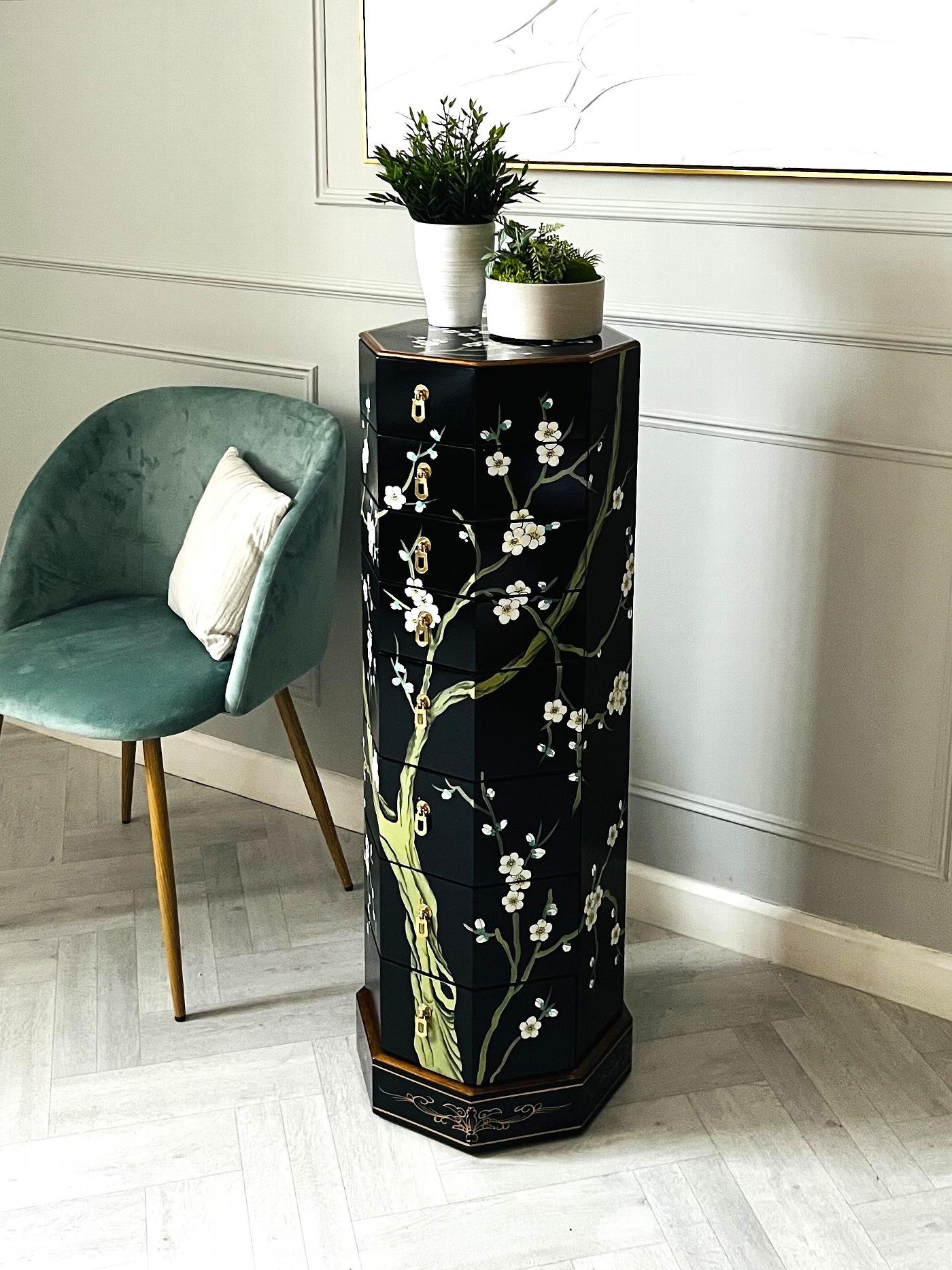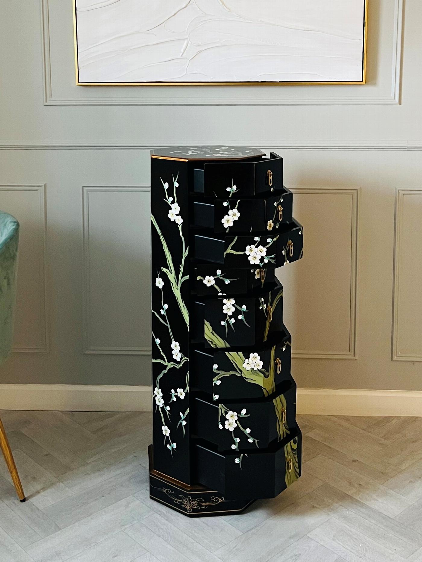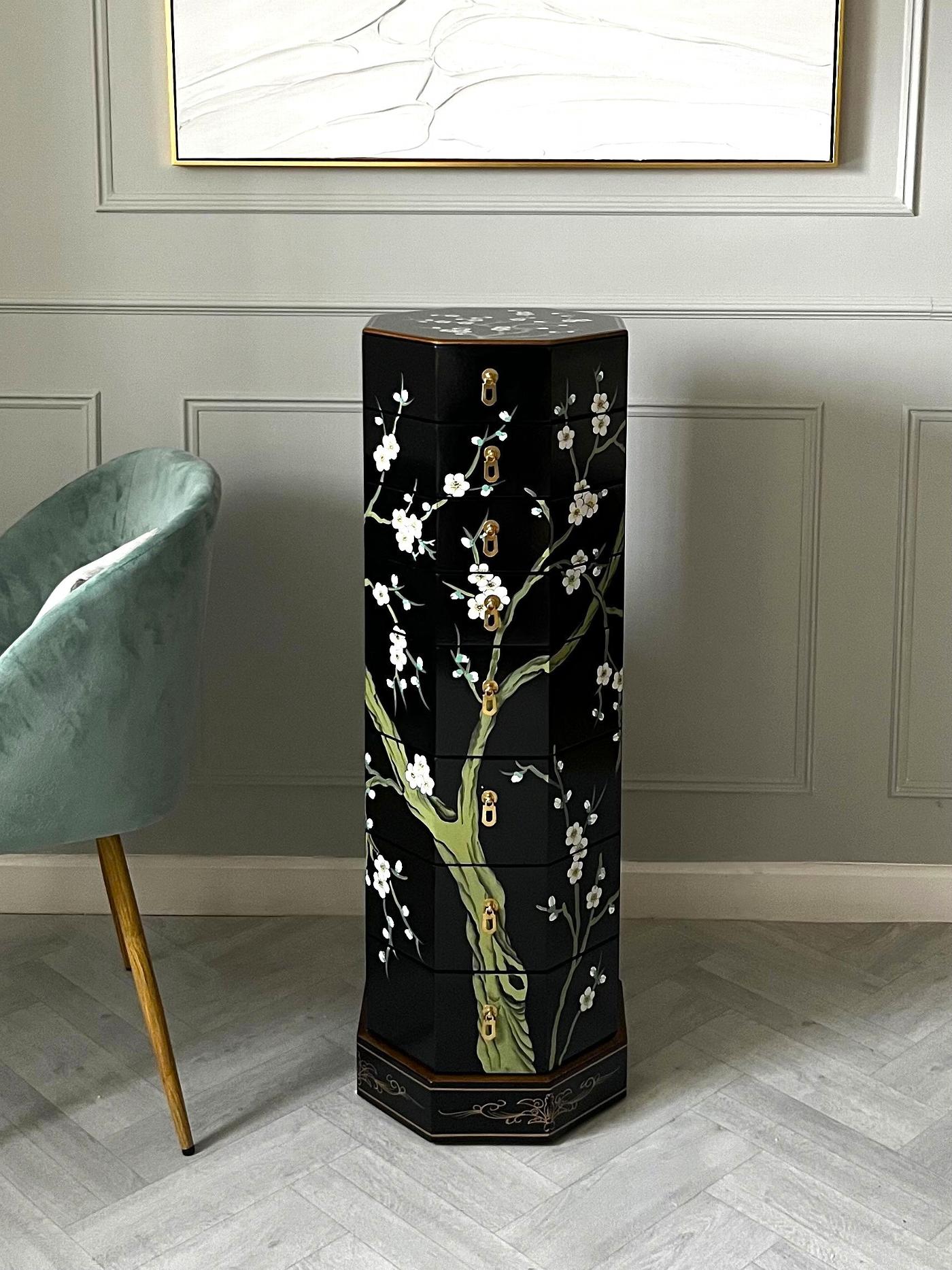 Black Lacquered Hand Painted Blossom Pedestal Chest of Drawers Stand with 8 Lined Drawers