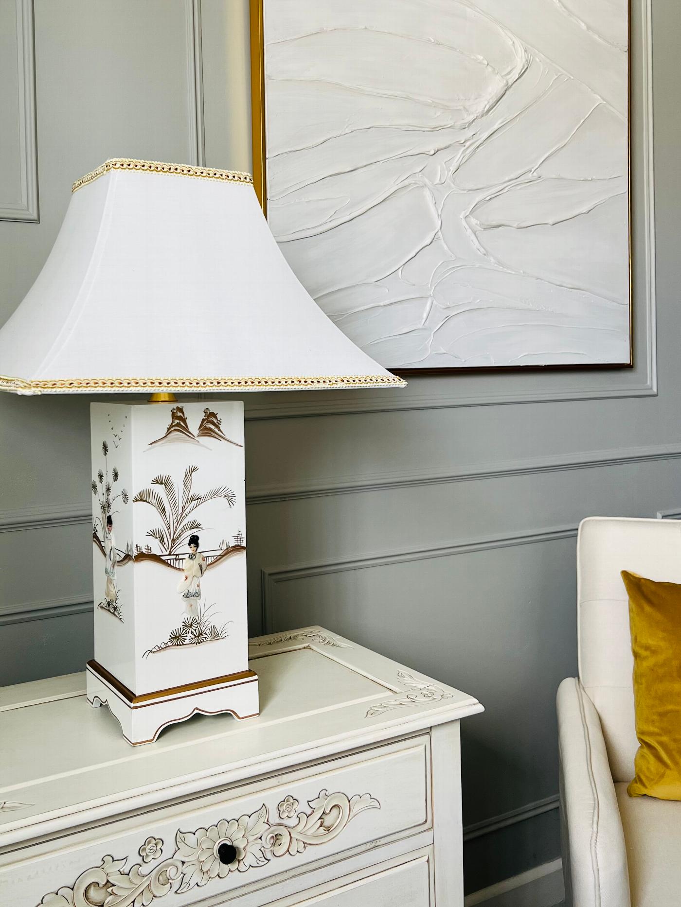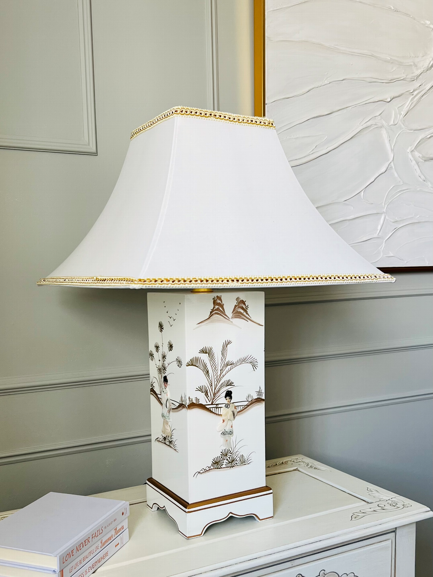 Chinese Hand Painted square Table Lamp with stunning hand painted detail and adorned with carved Mother of Pearl Figurines. Supplied Cream Square Shade with Gold embroidered trim .